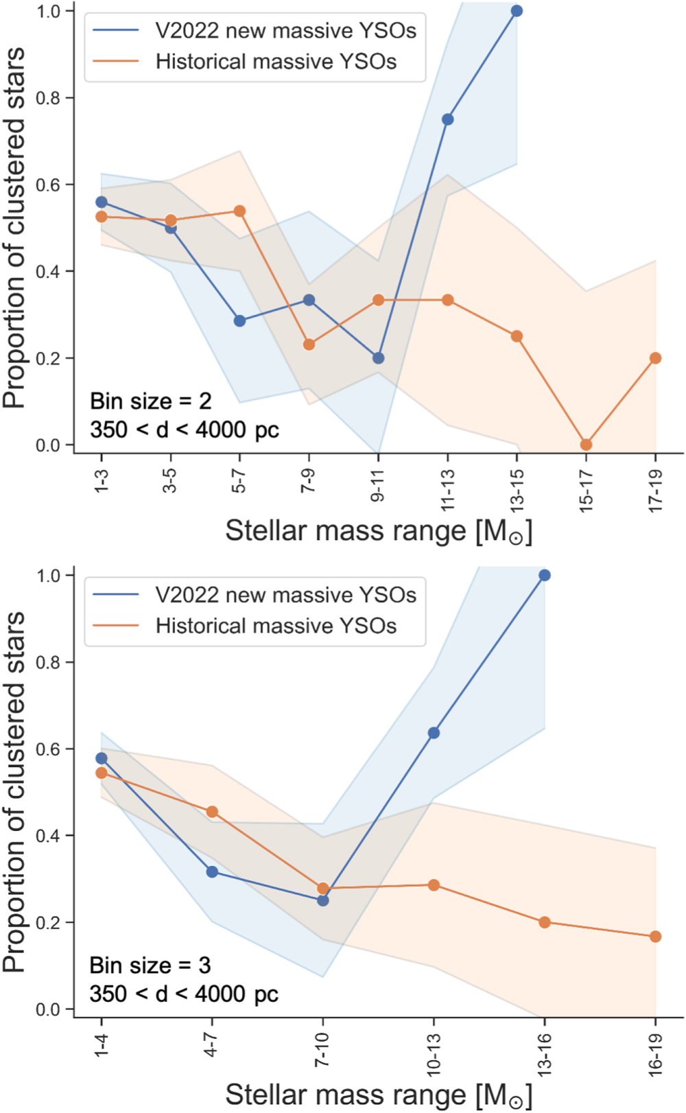 We analyzed the clustering properties of high-mass Young Stellar Objects, by the application of the machine learning algorithm HDBSCAN on the entire Gaia DR3 data release to assess the proportion of Young stellar objects that belong to a cluster or were formed in isolation. Since these objects are too young to move from their birthplace, this can then be linked to the formation mechanism that took place and help distinguish between monolithic collapse or competitive accretion models (as competitive accretion requires interactions in clusters). We found the clustering ratio to be a function of stellar mass, with a statistically significant decrease in clustering for objects around the 7-9 solar mass bin.