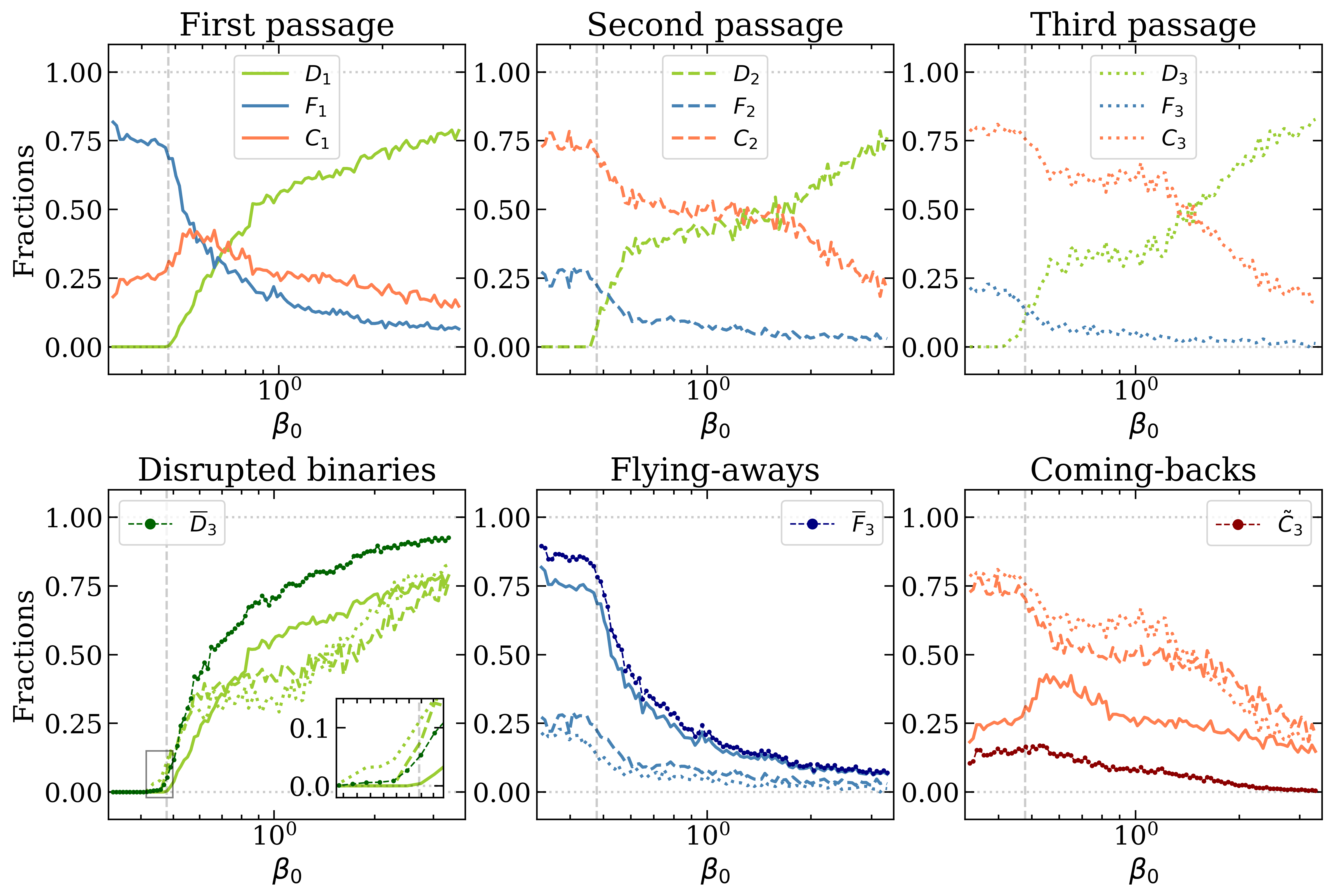 The figure represents the fraction of systems disrupting (D), flying-away (C) or coming back for a second or third interaction (C) as a function of how deep the binary penetrates the BH tidal sphere, going from shallow to deep encounters from left to right.