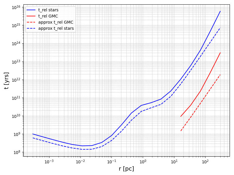 The figure shows the energy relaxation time scales as a function of radius for stars (blue) and GMCs (red). Solid lines are computed using a Monte Carlo framework. Dashed lines show analytic estimates. Stars dominate scattering processes at smaller radii while GMCs at large radii.